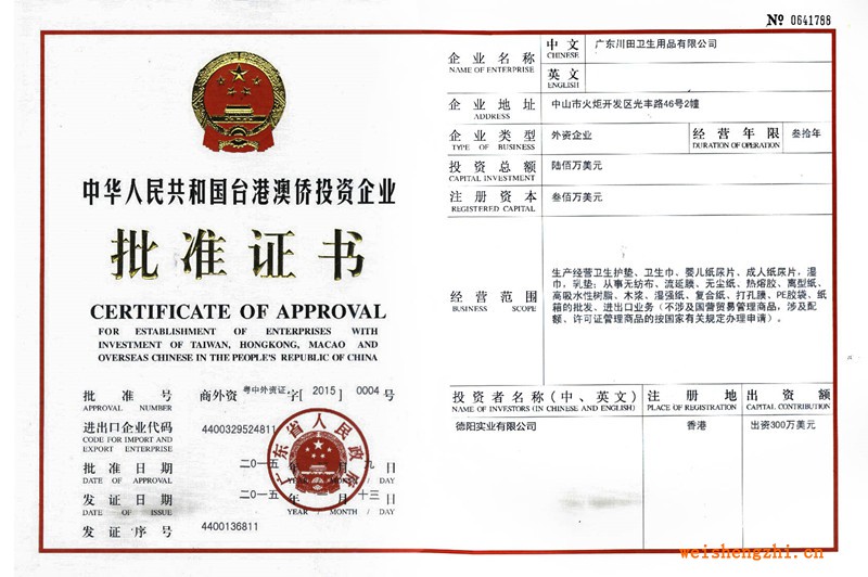 臺港澳僑投資企業批準證書