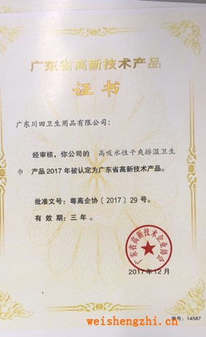 廣東省高新技術產品證書(輕呼吸棉柔衛生巾產品)