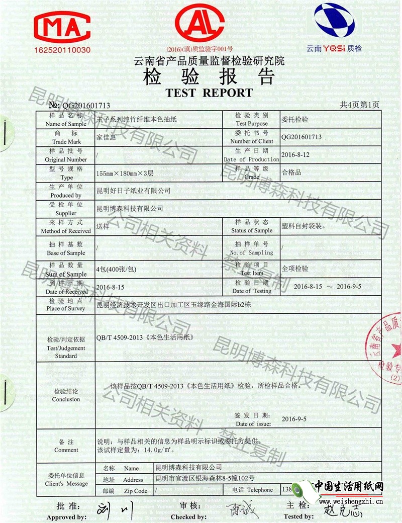 王子純竹纖維本色生活抽紙質檢報告,按照標準項目,所有指標全檢,并全部合格!