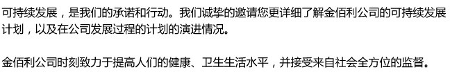 可持續(xù)發(fā)展是全世界面臨的新發(fā)展課題,特別是對于正經(jīng)歷高速經(jīng)濟(jì)騰飛的中國,將可持續(xù)發(fā)展與經(jīng)濟(jì)發(fā)展、人民日益增長的物質(zhì)文化需要相結(jié)合是我們維持長久、健康、快速業(yè)務(wù)增長的關(guān)鍵環(huán)節(jié)。在不斷引進(jìn)金佰利旗下一流高質(zhì)量產(chǎn)品,對中國寶寶、女性、老人和中國家庭提供世界級關(guān)愛的同時,我們珍惜自然資源、保護(hù)生活環(huán)境、服務(wù)周圍社區(qū)、關(guān)注人才發(fā)展,積極推動可持續(xù)發(fā)展的方方面面。