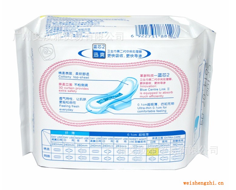4、革新科技--藍芯2,衛生巾第二代中央處理器,更快吸收,更快導滲。