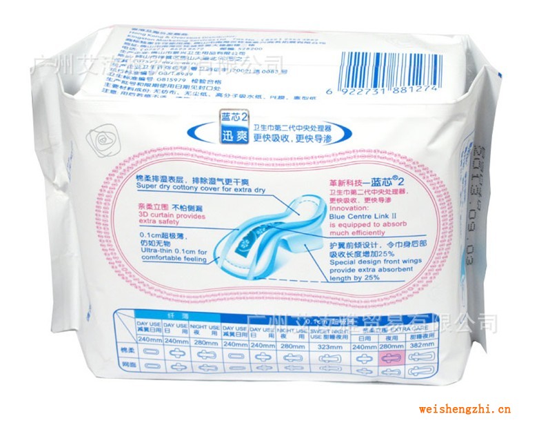 4、革新科技--藍芯2,衛(wèi)生巾第二代中央處理器,更快吸收,更快導滲。