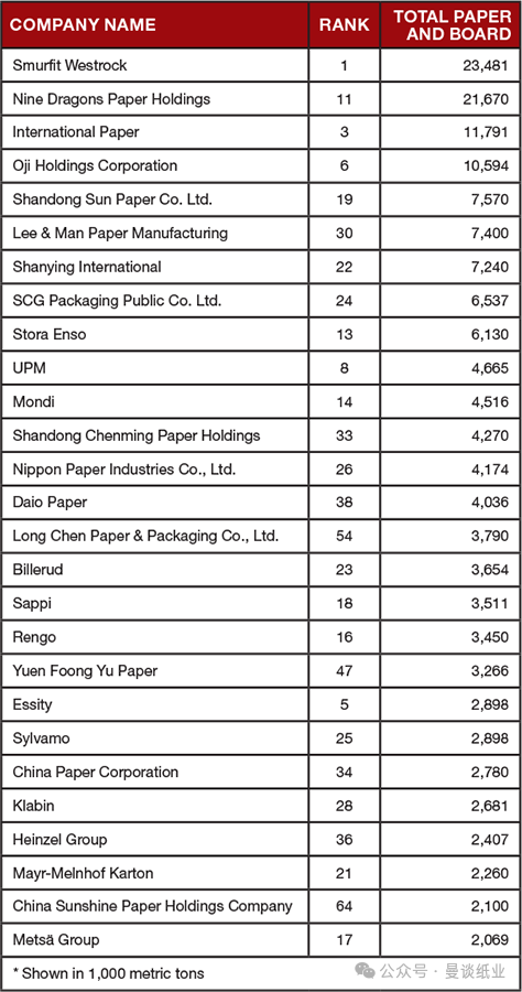 報告還公布了全球27家紙及紙板產(chǎn)量(產(chǎn)能)超過200萬噸(公噸)的造紙企業(yè)名單,合并后的愛爾蘭Smurfit WestRock超過了中國的玖龍紙業(yè),排名第一,達到2348.1萬噸;玖龍紙業(yè)排名第二,達到2167.0萬噸;是全球唯二的產(chǎn)量超過2000萬噸的企業(yè)。