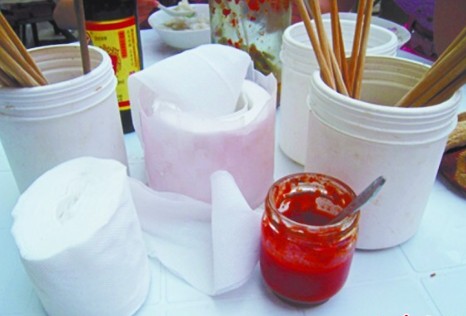 有市民撥打本報(bào)熱線電話反映,有的小吃攤、餐館的餐巾紙紙張非常薄,遇水便會(huì)立即濕透并成渣狀,與正規(guī)餐巾紙有顯著差異。而且有的紙面上還有黑點(diǎn) ,撕扯時(shí)會(huì)有一些碎屑脫落,用起來(lái)讓人很擔(dān)心。記者對(duì)此進(jìn)行了采訪,發(fā)現(xiàn)一些餐館和小吃攤?cè)匀粚⑿l(wèi)生紙當(dāng)作餐巾紙擺上餐桌,供就餐的市民使用。