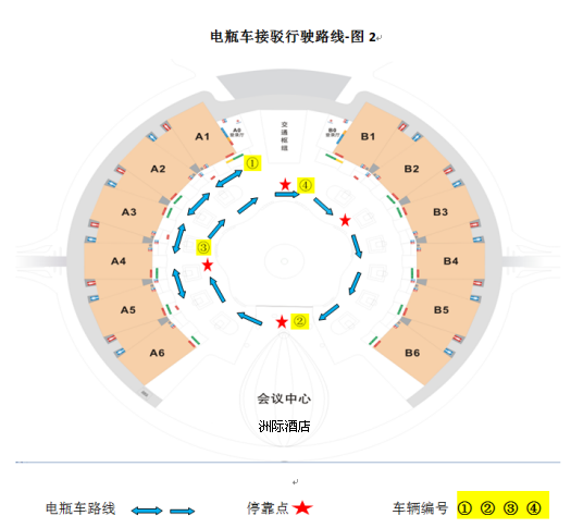 ●封閉區域外,②、③、④號車;從洲際酒店會議中心—A4入口—A0/B0登錄廳入口—B2館出口—會議中心,整圈循環行駛。想往返A區、B區、洲際酒店的觀眾,只需招招手,就能搭上“順風車”。