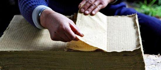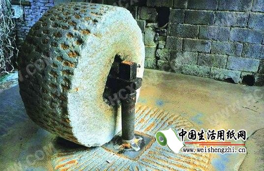 舀紙,將已經(jīng)發(fā)軟的慈竹攤在碾盤里,用黃牛拉著石碾子反復(fù)碾壓,直至碾成粉末,將竹粉末裝進(jìn)石缸,加入水?dāng)嚢璩杉垵{,然后覆一層網(wǎng)狀簾子,一下一下“舀”,每一次能舀出兩張濕紙。將濕紙倒在紙墩上,一缸紙漿舀完后,用榨板將濕紙榨干水分,紙張不沾手時(shí)再一張張扯開晾曬在竹竿上。因?yàn)樗胁僮魅鞘止ぃ俣茸匀槐容^慢,一人一天多只能舀30斤左右。
