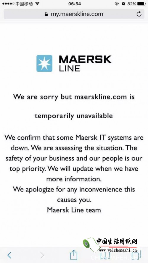 據《中國航務周刊》的消息,馬士基在中國的業務已經受到影響,中國分公司已經切斷與總公司的服務器和網絡鏈接。目前,與總公司的聯絡使用的是內部短信通道。馬士基作為全球領先的船公司,在IT系統領域的開發和使用也遙遙領先,因此,如果這個事件不能盡快解決,所有與馬士基有業務往來的相關公司都可能存在潛在危險。