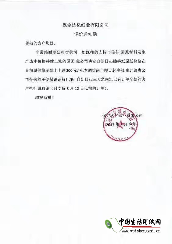 保定市億達紙業有限公司漲價函: