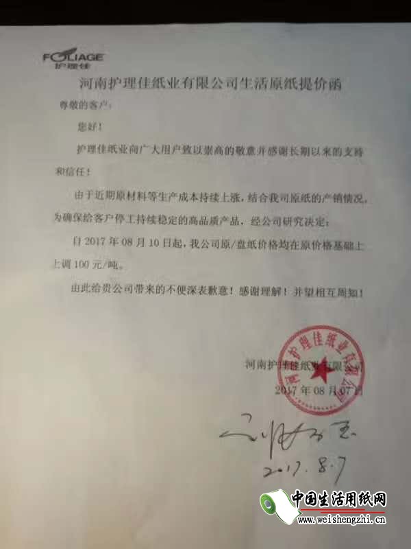河南護理佳紙業有限公司生活原紙漲價函: