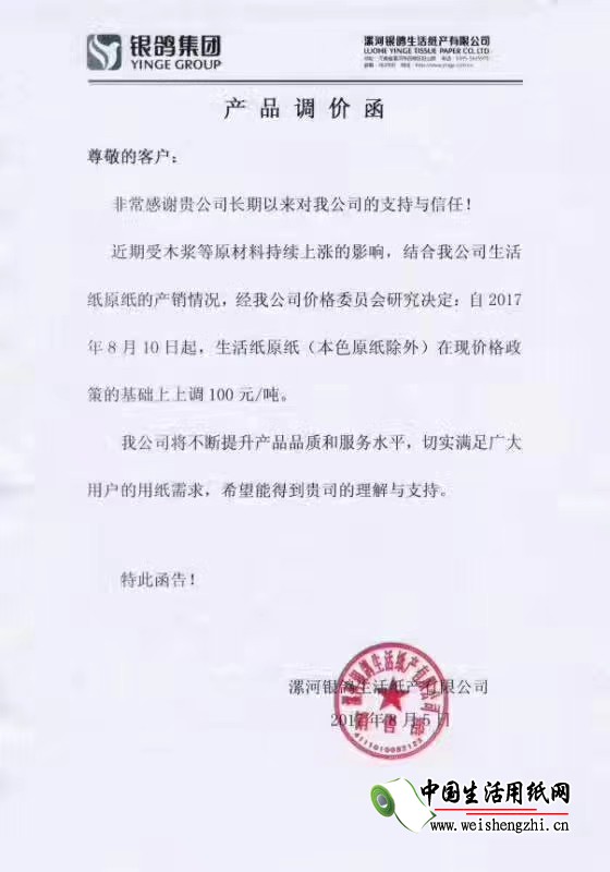 河南銀鴿生活用紙產有限公司漲價函: