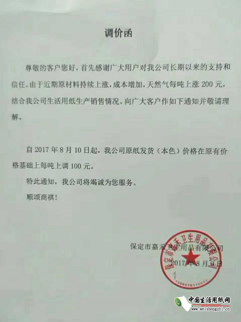 保定市嘉禾衛生用品有限公司漲價函: