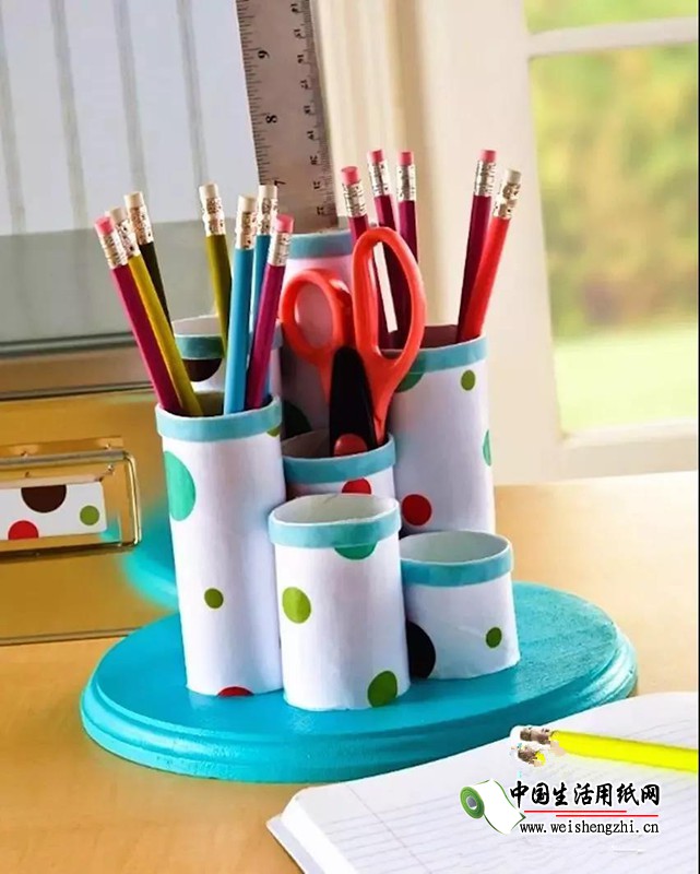 將卷紙芯重新涂顏色后,粘在一塊木板或者紙片上加固,就可以做成一個簡便式筆筒,辦公用筆什么的都可以放。