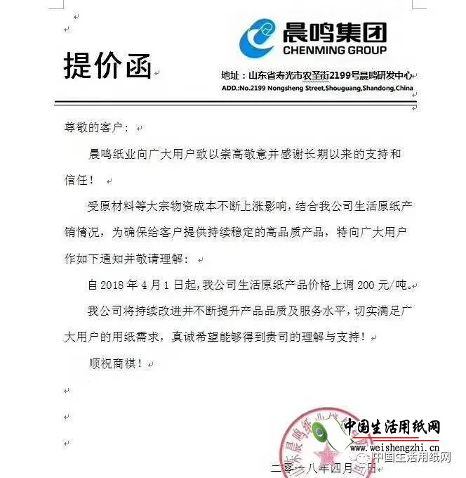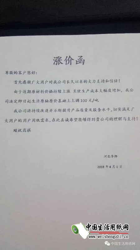 河北華邦衛生用品有限公司:由于近期原材料價格上漲,致使生產成本大幅增加,我公司決定自2018年4月1日起生活原軸在原價格基礎上上調100元/噸。