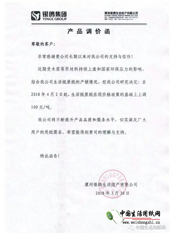 漯河銀鴿生活紙產有限公司:受原材料持續上漲和環保壓力,公司研究決定:自2018年4月2日起生活紙原紙在現價格政策基礎上上調100元/噸