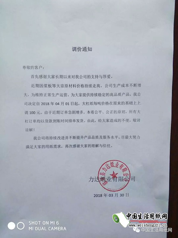 力達紙業有限公司:因漿板等大宗原材料價格的持續走高,公司成本不斷增大,為維持正常運營,為大家提供穩定的高品質產品,公司決定從2018年4月1日起,大杠紙每噸價格上調100元。