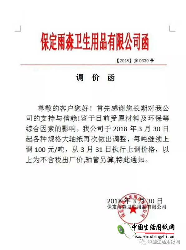 保定雨森衛生用品有限公司:受原材料以及環保等綜合因素的影響,我公司于2018年3月30日起各種規格大軸紙在做出調整,每噸上調100元/噸。