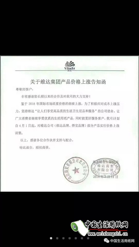 維達商貿有限公司:受國際紙漿的價格持續上漲的影響,為了更好的服務客戶,我司計劃自2018年4月1日起,對維達公司(維達品牌、得寶品牌)部分產品實施價格上漲調整。