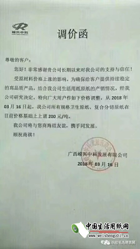 廣西嶸興中科發展有限公司:受原材料上漲的影響,從2018年3月16日起,我司所有規格衛生紙原紙上調200元/噸。
