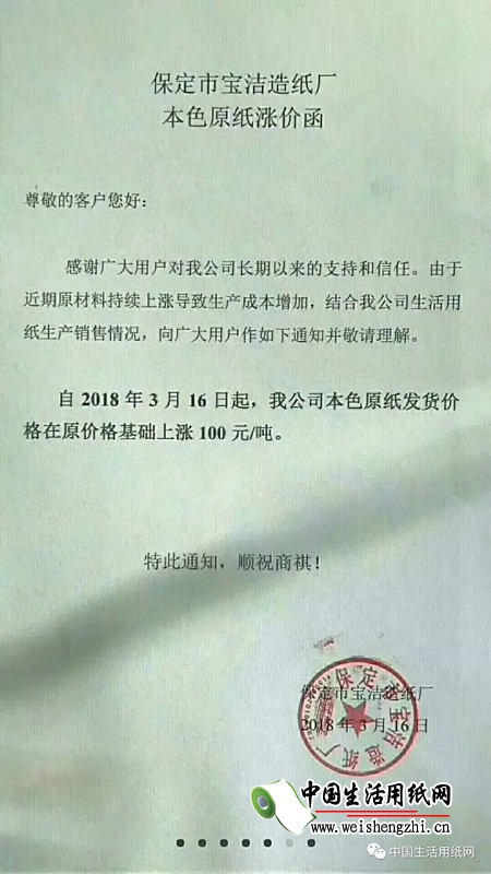保定市寶潔造紙廠本色原紙:受原材料上漲導致成本增加,結合我公司生活用紙生產銷售情況,因此從2018年3月16日起,我司本色原紙發貨價格在原價基礎上上漲100元/噸。