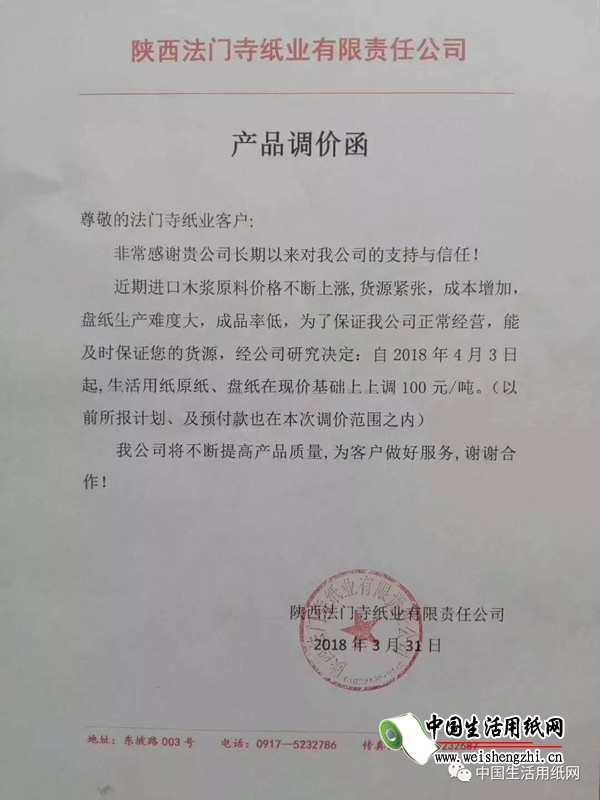 陜西法門寺紙業有限責任公司:受近期原材料價格不斷上漲,成本增加。為了保證我公司正常運營,經公司研究決定:自2018年4月3日起,生活用紙原紙、盤紙在現價基礎上上調100元/噸。