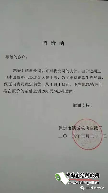 保定市滿城成功造紙廠:由于近期進口木漿價格上漲,為了維持正常生產經營,自2018年4月1日起衛生紙原紙銷售價格在原價的基礎上上調200元/噸。