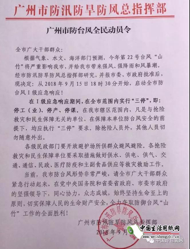 廣州市人民政府決定從2018年9月15日18時(shí)30分開始,啟動(dòng)全市防臺(tái)風(fēng)I級(jí)應(yīng)急響應(yīng),除醫(yī)院、供水、供電、供氣、電信等特殊行業(yè),在全市范圍內(nèi)實(shí)行“三停”,即:停工(業(yè))、停產(chǎn)、停課。請(qǐng)廣大市民群眾提前做好防范,正確防災(zāi)避險(xiǎn)。