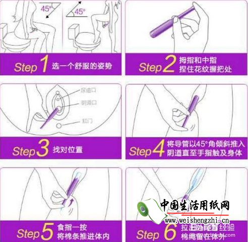 衛生棉條主要分為兩大類,一類是棉芯外側有光滑導管包裹的導管式衛生棉條,另一類是無導管包裹的指推式棉條。指推式棉條更適合操作自如的熟手使用,而導管式棉條則新老皆宜。接下來以導管式衛生棉條為例來示范下具體的使用方法。