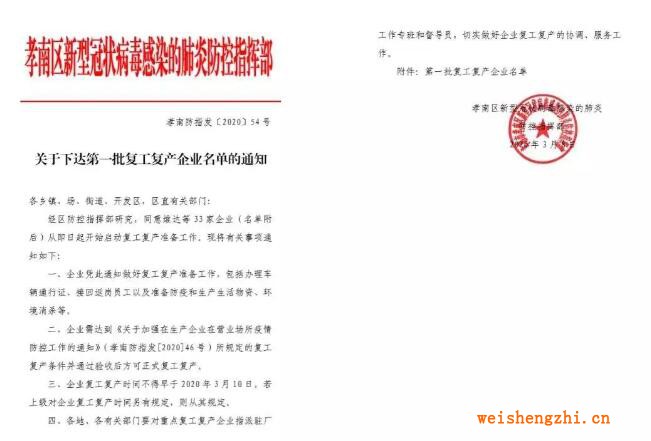該通知表示,經區防控指揮部研究,同意維達等33家企業從即日起開始啟動復工復產準備工作。