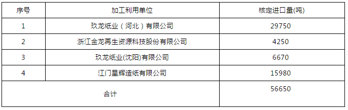 7月24日,環保部固體廢物與化學品管理技術中心公示了2020年第10批限制進口類產品明細,共有玖龍紙業(河北)有限公司、浙江金龍再生資源科技股份有限公司、玖龍紙業(沈陽)有限公司和江門星輝造紙有限公司4家造紙企業獲批,總核定量5.665萬噸。這是2020年三季度公布的第二批進口名單,截至目前,2020年總批準量達到574.53萬噸,占去年總量的53.435%。