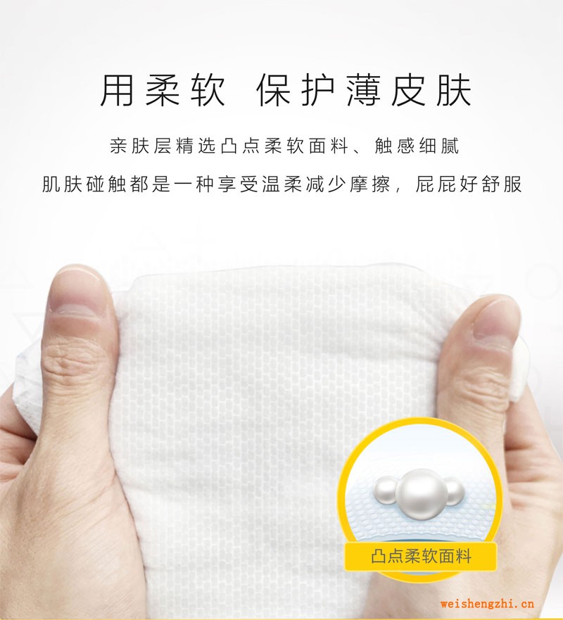 ,柔柔的代表,珍珠凸點面層,凈柔面層柔軟肌膚;貼身裁剪,曲線設計,柔和貼身;進口住友高分子吸水和三大雅黃金組合,純凈柔軟,大吸量,整夜安睡;
